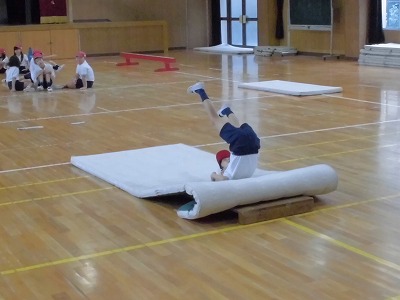 ジャンプ、マットでの横転(ゴロゴロ)、平均台でのバランス、前回り、3段の跳び箱、後ろ回りなど、子どもたちは楽しみながら運動をしていました。