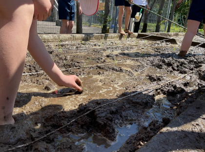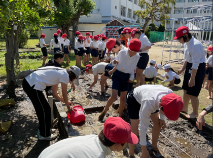 初めは「泥の中に足を入れるのは・・・「汚れそう・・・」と言っていた子どもたちですが、気が付くとみんなで声をかけ合い、手足を泥まみれにしながら活動してました。