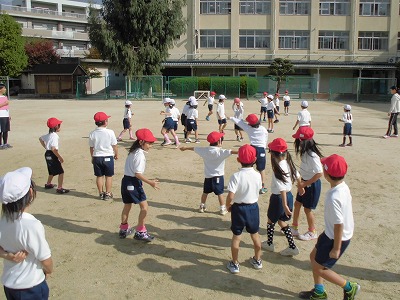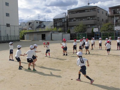 ボールは教室にあるドッジボールよりひと回り小さいものですが、1〜2mしか投げられなかったり、友だちの方向とは全然違う方向に行ったりしていました。