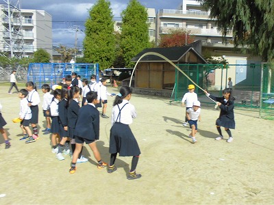 各班を見て回ると、多くの班が高学年さんがなわを持ち、低学年さんが飛びやすいように調整して回してくれていました。