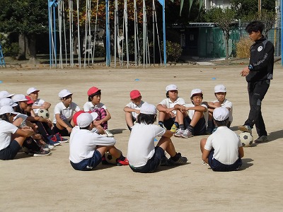 元徳島ヴォルティスのJリーガーの方がコーチになり、実際に練習をしてサッカーの試合を行いました。鬼ごっこをまじえたゲームから始まり、リフティングのコツや、パス、ドリプルなどを教わりました。