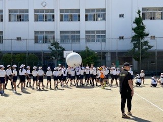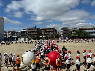 全校児童による大玉送りの並びや、競技の説明を聞き