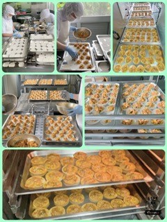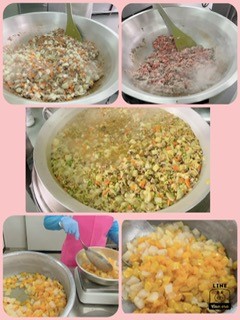 変わりピザは、ツナ、コーン、ピーマン、ピザソース、チーズを混ぜ合わせ、ぎょうざの皮を並べて、調理員さんが一つずつていねいに具材をのせて、焼き物機で焼いています。
