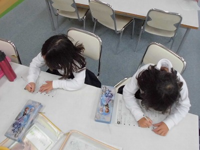 準備された算数のプリントや漢字のプリントを、お互いにできた枚数を競うように解いていました。