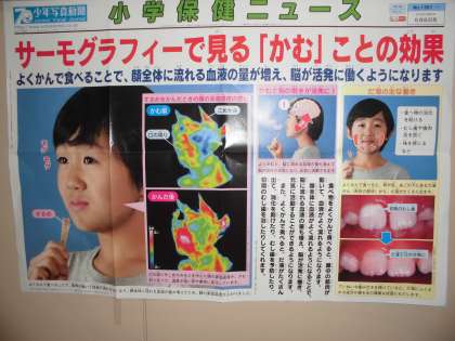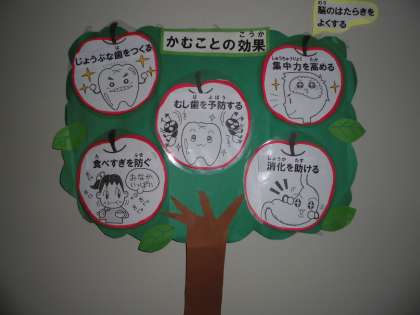 6月4日〜10日は、「歯と口の健康週間」です。よくかんで食べていますか?よくかんで食べると、だ液がたくさん出て、消化を助けたり、むし歯を予防してくれます。また、顔全体に血液が流れるようになることで、脳に流れる血液の量も増えて、脳のはたらきが活発になり、元気に活動できます。