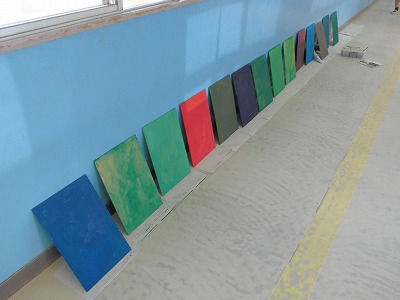このクラスでは、作品展に向けて、机の大きさほどの板材に絵具で色を塗っていました。