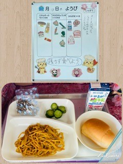 カレースパゲッティは豚ひき肉を主材に、ベーコンで旨みを増し、カレールウの素などで味付けしたスパゲッティです。児童に好評な献立です。スパゲッティは半分におってから1袋ずつ検品した後、湯がいています。