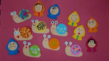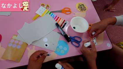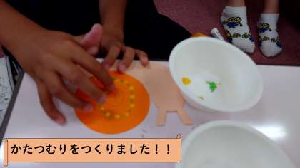 なかよしタイムで掲示用のかたつむりをつくりました。人によって目や口、殻にちがいがあっておもしろかったです。また、あまった時間を使ってカッパを着たこどもの顔もかきました。掲示するのがとても楽しみです。