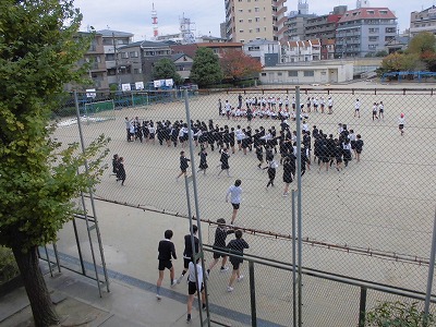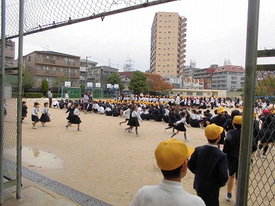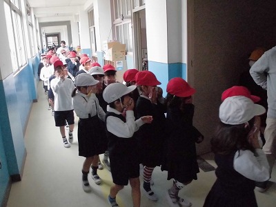 先生の指示に従って、ハンカチなどで口をふさいで、校舎内では走らず、運動場に出たら避難集合場所の砂場前まで駆け足です。