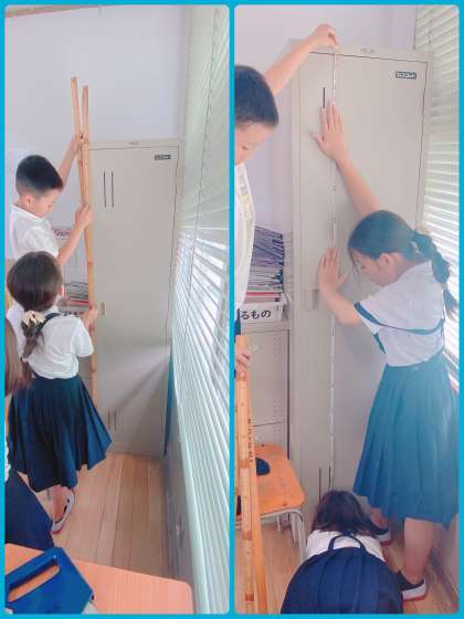 まきじゃくと1mさしを使い、教室の色々な物の長さを測りました。