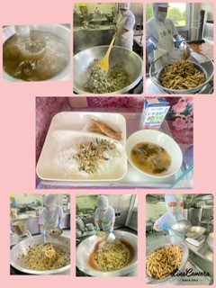 五目汁はだしこんぶとけずりぶしでだしをとり、キャベツ、たまねぎ、たけのこ、にんじん、わかめを使用しています。