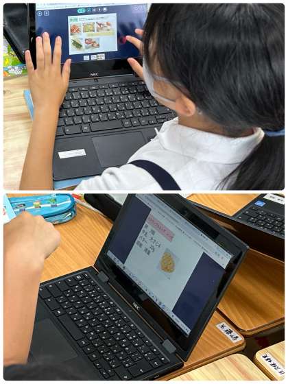 材料や食材の切り方、調理の手順、役割分担などを話し合い、班で協力してロイロノートにまとめています。