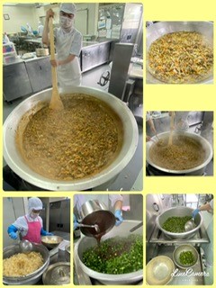 和風カレー丼は、だしこんぶとけずりぶしでだしの風味をきかせた和風のカレーをごはんの上にかけます。児童に大人気の献立です。