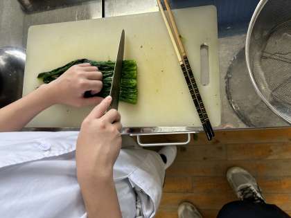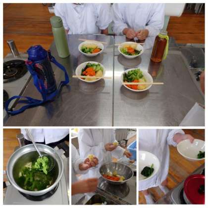 お茶に引き続き二回目の調理実習としてほうれん草のおひたしとゆで野菜のサラダを作りました。なかには初めて包丁を使うという児童もいて、けががないようにとヒヤヒヤしながら見守っていました。無事にけが人なく終えることができ、良い調理実習になりました。