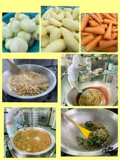 鶏肉と野菜のみそ煮は鶏肉を主材に、じゃがいも、たまねぎ、にんじん、たけのこ、しいたけ、青みにさんどまめを使用し、味つけに赤みそを使用した煮ものです。