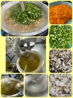 ハムとはるさめのスープはハムを主材に、しいたけで旨みを増し、たまねぎ、にんじん、青みにチンゲンサイを使い、彩りよく仕上げています。