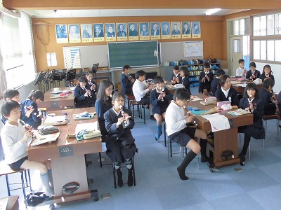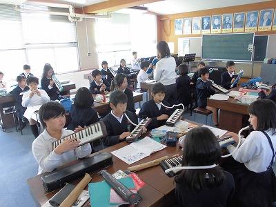 このクラスでは、「茶色の小びん」という曲を、楽しそうに、そしてリズミカルに、けん盤ハーモニカやリコーダーで演奏していました。