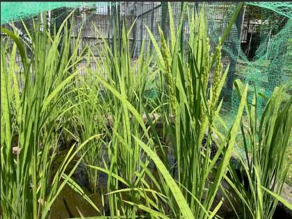 夏休みに入り、静かな学校です。学習園の田んぼでは、5年生が植えた苗が太陽を浴びてすくすくと生長しています。よく見ると、「穂」が出始めているのを発見しました。夏休みが終わるころには、どんな生長がみられるでしょう。楽しみです。