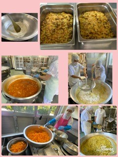 カレーマカロニグラタンは、ベーコンを主材にしたカレー味のグラタンです。クリームを使用することでコクを出しています。大きい釜で小麦粉をからいりして、野菜をいため味付けし、再び小麦粉を入れ混ぜて合わせて、ミニバットに入れて焼き物機で焼きます。