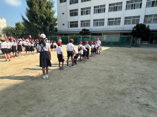 「ボール送り」ゲームをたてわり班に分かれて取り組みました。