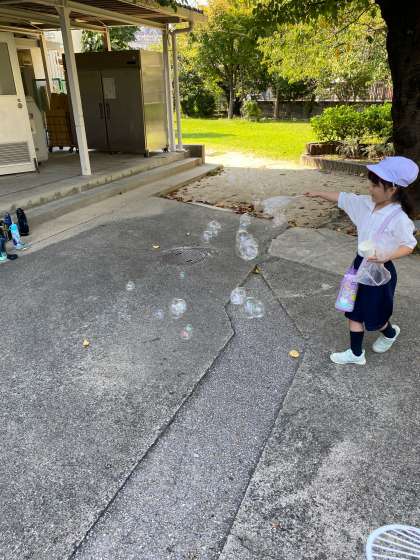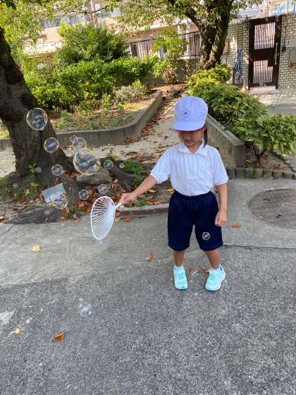 ストロー・紙コップ・モール・うちわの芯などを使って、シャボン玉を作りました。