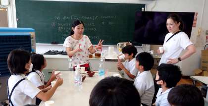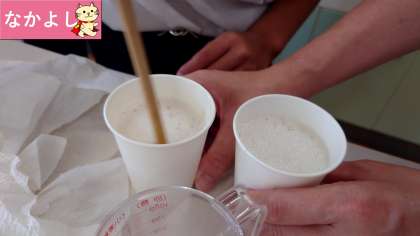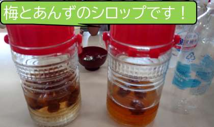 1学期に収穫した梅とあんずのシロップを使って梅とあんずのジュースをつくりました。びんの中の観察をした後、水100ccに対してシロップ大さじ1を入れ、よく混ぜてから飲みました。甘くておいしいと感じた子や少しすっぱいと感じた子がいて、味を楽しむことができました。次回のなかよしタイムでは、作ったジュースを使ってお店を開く準備をします。