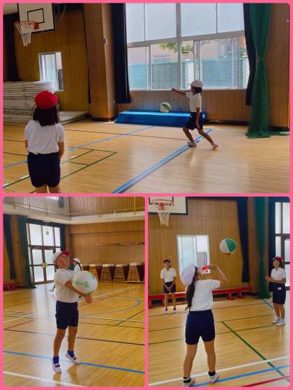 今回はまずトス、アタック、レシーブ、バウンドパスの練習をグループで行いました。手の角度でボールがとぶ方向が変わるので、どの角度がよいのか考えながら取り組みました。