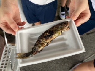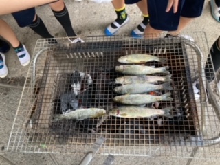 捕まえた魚は、その場で焼いていただきます。塩をふって味付けです。命に感謝して、いただきます。
