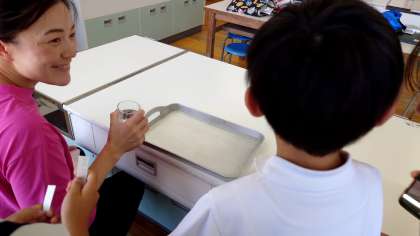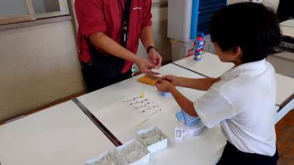 なかよしカフェで行うお店の役割に分かれて、先生たちをお客さんと見立てて練習しました。「いらっしゃいませ」や「ごちゅうもんはこちらです」などみんなで声をかけながら、注文を受けたり、ジュースを作ったり、席に誘導したりしました。本番のなかよしカフェの活動がとても楽しみですね。