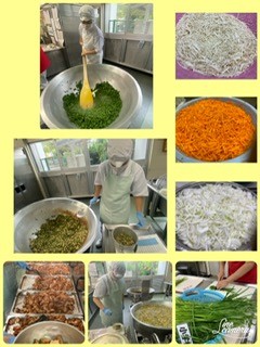 焼き豚のスープは焼豚、はくさい、たまねぎ、にんじん、えのきたけ、青みににらを使用しています。マイルドでやさしい味に仕上がっています。