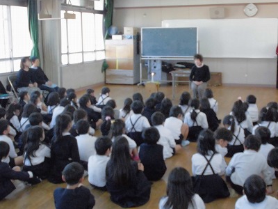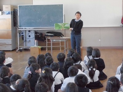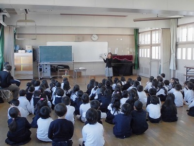 東淀川図書館から館長さんとボランティアの2名の方が来てくださり、2時間目に1年生、3時間目に2年生、4時間目に3年生が多目的室で、お話や絵本の読み聞かせをしてくださりました。