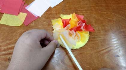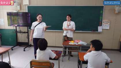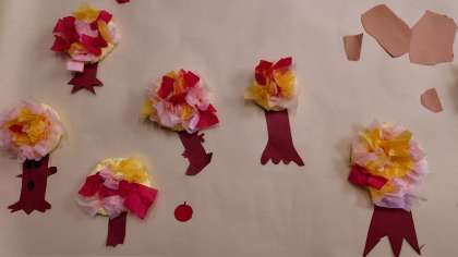 なかよしタイムで10月の掲示物をつくりました。黄色に染色した紙粘土に薄い色紙を割りばしでおしつけて色鮮やかな木ができました。りんごやはっぱは自分たちで考えてつくっていました。次のなかよしタイムも楽しみですね。