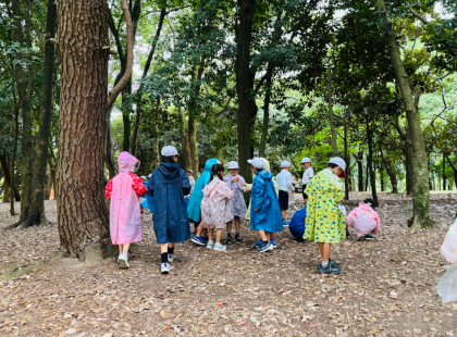 少し雨が降り、予定の順番を変更して先にたくさん木の実を拾いました。カッパを着てたくさんどんぐりや松ぼっくりを拾いました。