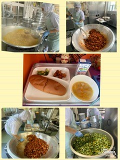 まぐろのオーロラ煮は、しょうが汁で下味をつけたまぐろに、でん粉をまぶしてなたね油であげて、ケチャップ、砂糖、赤みそで作ったタレをからませます。児童に人気のある献立の一つです。