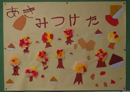 秋の掲示として『あきみつけた』というテーマで作っていたものが、ついに完成しました。以前作った木に合うように、かわいい栗を折り紙で作ってみました。次の掲示づくりも楽しみですね。