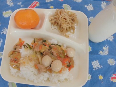 「中華丼」は、とっても具だくさんでした。豚肉、白菜、玉ねぎ、タケノコ、ニンジン、にら、しいたけ、しょうが、そして子どもたちが大好きな「うずら卵」が入っていました。大きな口をあけてパクパクと食べていました。