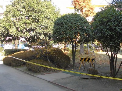 また、伐採した枝も、ごみの収集までは運動場の隅に置いてあります。こちらも近づかないでくださいね。