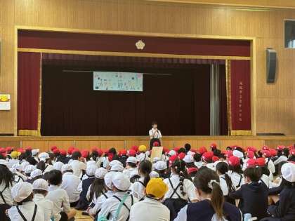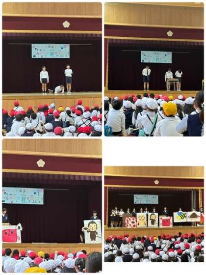 講堂に集まって閉会式を行いました。最後の締めに6年生の漫才、ペープサートによる「猿蟹合戦」を披露してくれました。
