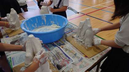 講堂で不思議な花の木版画と水ねんどのチームにわかれて行いました。版画は先月一度刷った経験もありとてもきれいに仕上がりました。水ねんどは家から持ってきた約3つのペットボトルを、水ねんどでしみ込ませた白のタオルで包みました。乾くまで楽しく待ちましょう。