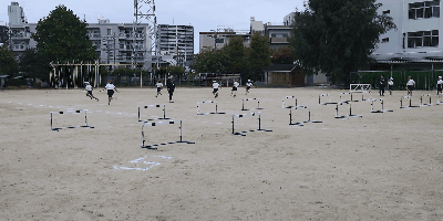 ハードル走と鉄棒運動にわかれて運動場体育をしました。ハードル走では、経験を重ねたこともあり、自分で決めた歩数でとべるようになってきました。