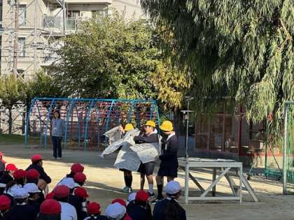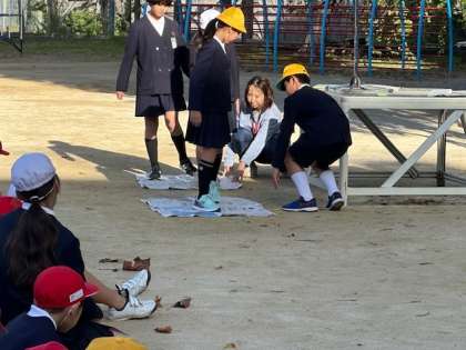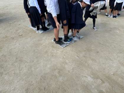 たてわり班で、3枚の新聞紙を使って渡っていきます。