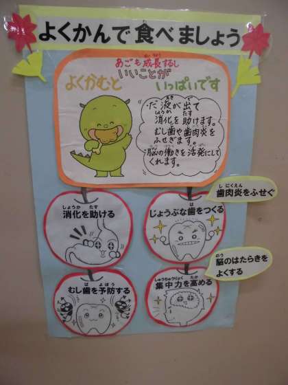 また、よくかんで食べましょう。よくかむことで、脳への血液のめぐりがよくなり、脳のはたらきがよくなります。今日ほけんだよりを配っています。しっかり読んでください!