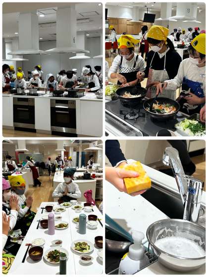 その後、「エコクッキング」として、災害時に炊飯器がなくてもお米が炊けるよう鍋でご飯を炊いたり、出汁を取った後の鰹節を再利用して「エコ・ふりかけ」を作ったり、普段は捨ててしまいがちなキャベツの葉脈などの硬い部分も細かく切ったりして「エコ・野菜炒め」を調理しました。限られた資源を大切に使うことの大切さを体験を通して学ぶことができました。