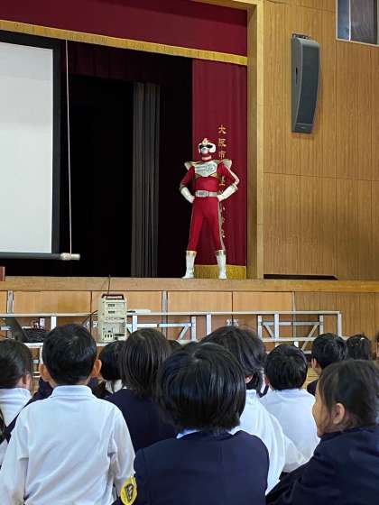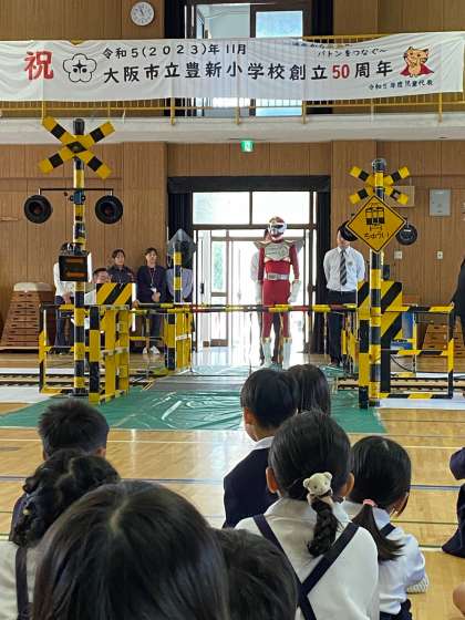 授業が始まると、「マモルンジャー」が現れ、踏切の渡り方を教えてくれました。