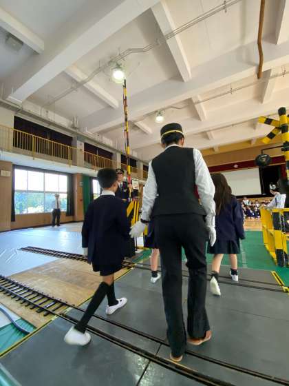 講堂に入ると、踏切がセットされていて、子どもたちから歓声が上がりました。
