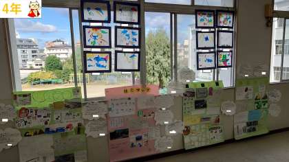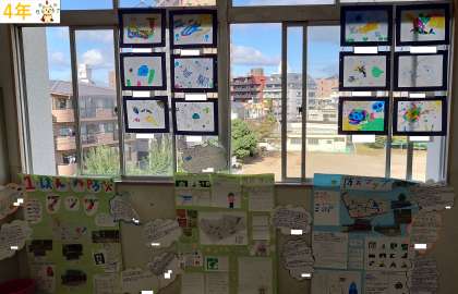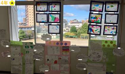 廊下にて光のさしこむ絵の掲示をしています。廊下にさしこむ太陽の光でとても色鮮やかになりました。お家に持って帰るのがとても楽しみです。