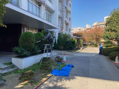 本日、業者の方に来ていただき、正門付近の剪定作業をしています。伸び切った枝や葉を剪定いただき、スッキリしました。