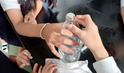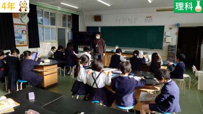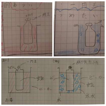 「空気は、温度によって体積が変わるのだろうか。」をめあてに学習しました。ガラスびんの口に、水でぬらした10円玉を置き、約40度のお湯であたためました。すると、10円玉がパタパタと動き、歓声が上がりました。次回は水の温度と体積について実験をする予定です。