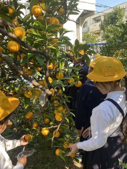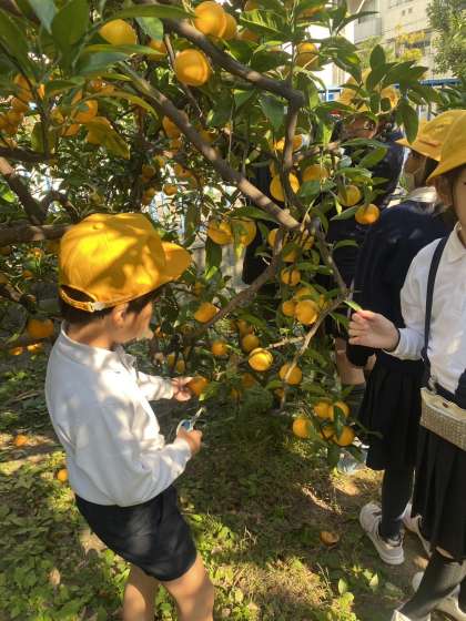 ・私はなるべくおいしそうなみかんを探していて、葉っぱの中においしそうなみかんがあり、先生に手伝ってもらい収穫しました。