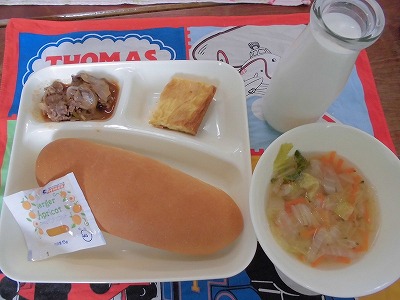 「焼きプリン」も給食室お手製です。私はとってもおいしく、好きな味なのですが、クラスを回ってみると、特に低学年で「いつものプリンがいい〜」「ちょっと苦い〜」「このプリンは苦手〜」と言っている児童が多かったです。
